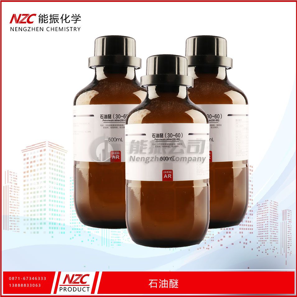 石油醚是一种无色透明、具有煤油气味的易挥发性液体。它主要由戊烷和己烷等低分子量烷烃组成,不溶于水,但能溶于多种有机溶剂,如无水乙醇、苯、氯仿等。石油醚的沸点较低,通常根据其沸点不同,可分为30-60℃、60-90℃、90-120℃等不同的规格。由于其高挥发性和溶解能力,石油醚在工业和实验室中被广泛用作溶剂、色谱分析溶剂和油脂的抽提剂。此外,它还可用于有机合成和化工原料 [^1^][^3^]。